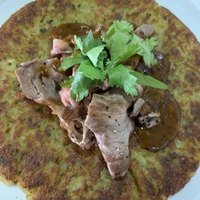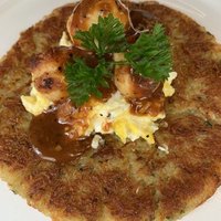 Potato pancake with chicken meatballs ans special made rosemary sauce